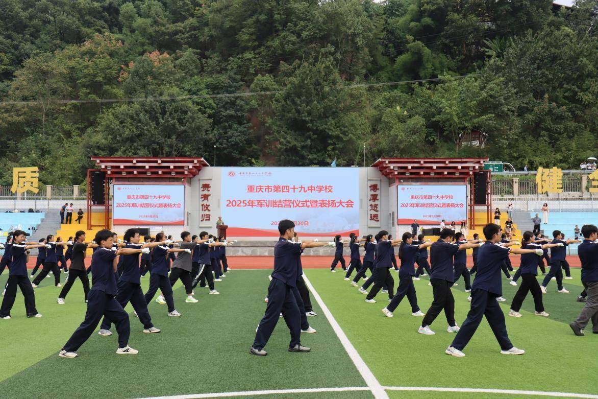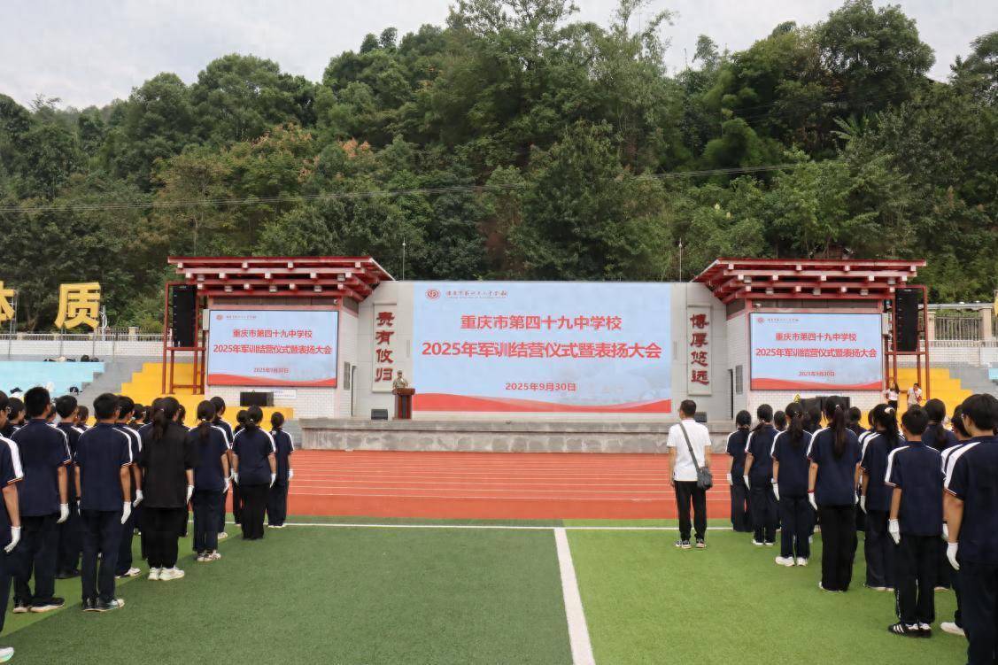 “四九学子,责当立行!”9月30日,重庆市第四十九中学校的运动场上旌旗猎猎,呼号声阵阵。在国庆节来临之际,学校举行了军训结营暨总结表扬大会,全体高一新生用历经七天磨砺与淬炼的昂扬姿态向祖国献上最诚挚的生日祝福。