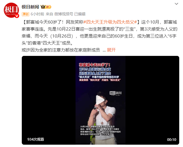 这个10月,郭富城家喜事连连。先是10月22日喜迎一出生就漂亮极了的“三宝”,第3次感受为人父的幸福,而今天(10月26日),他更是迎来自己的60岁生日,成为第三位进入“6字头”的香港“四大天王”成员。